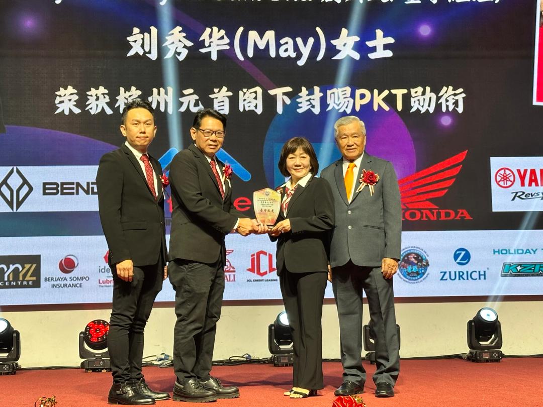 当晚大会也颁发牌匾给荣获槟州元首封赐PKT勋衔的槟州摩托车商公会署理会长刘秀华。
