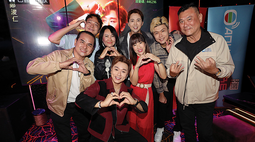 多位与王郑浚仁(前半蹲者)一起参加《中年好声音3》的战友也出席支持,中排左起刘传民、何平秋、张淑凤、何平亮,后排左起李俊颉、陈奕伸和萧伟伦。