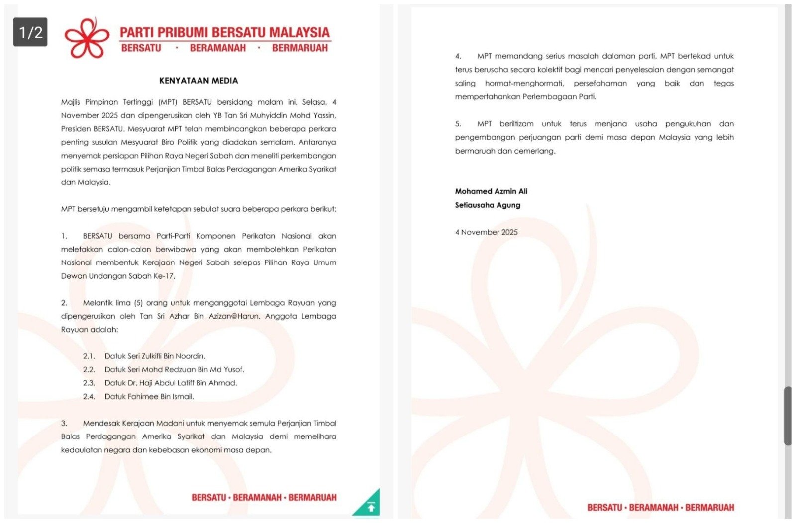 此外,阿兹敏也补充,最高理事会会议也讨论了沙巴州选举的准备工作,并审视国内外政治发展,尤其是马来西亚与美国签署的《马美互惠贸易协定》(RTA)。