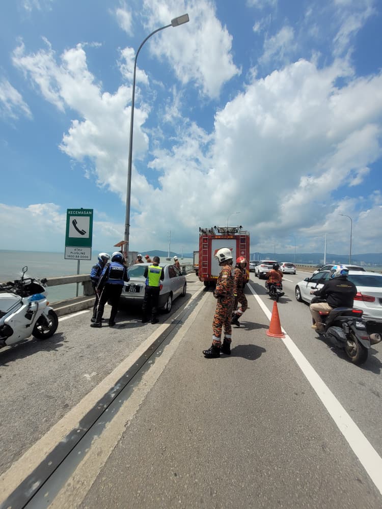 槟州消拯局下午发文告指出,该局于今日中午12时15分接到投报后,北赖消拯局(BBP Perai)第一时间派出1辆消防车与8名队员赶赴槟城大桥2.2公里(北海往槟岛方向)。