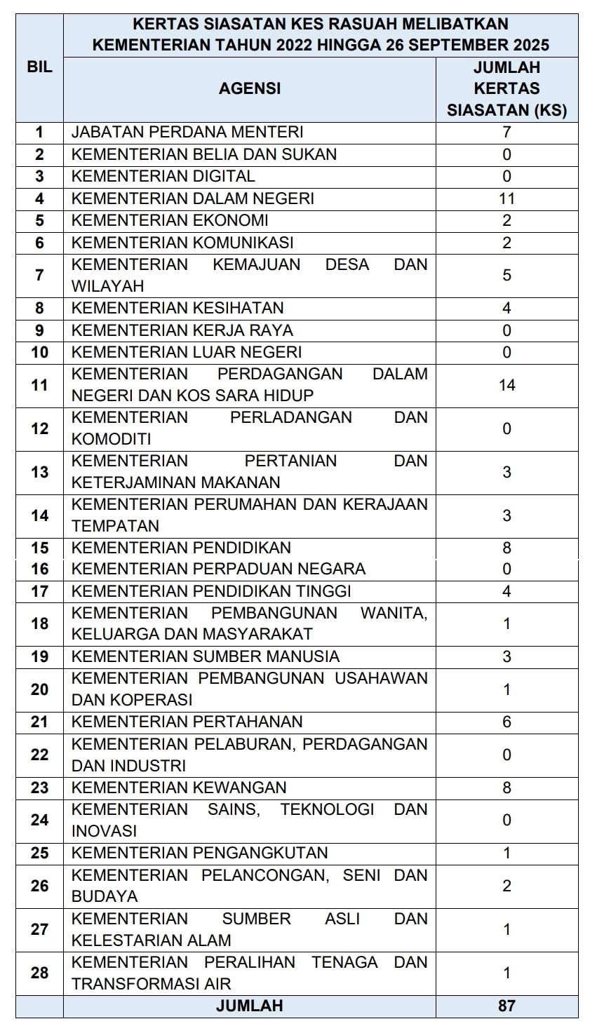 从2022年至2025年9月26日,反贪会共开了87份档案彻查涉及公务员贪污的案件,其中涉及国内贸易及生活成本部的部门最高(14份)、接着是内政部11份及财政部与教育部(皆8份)。