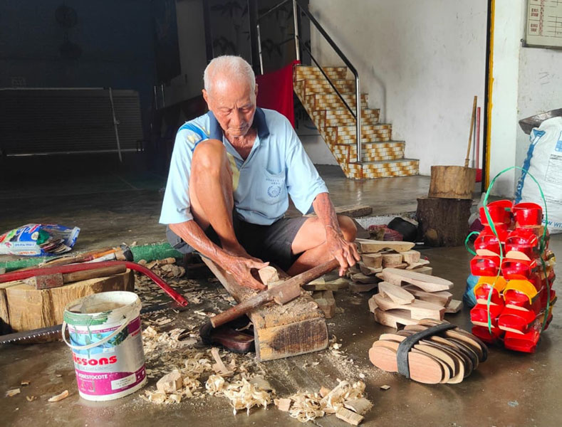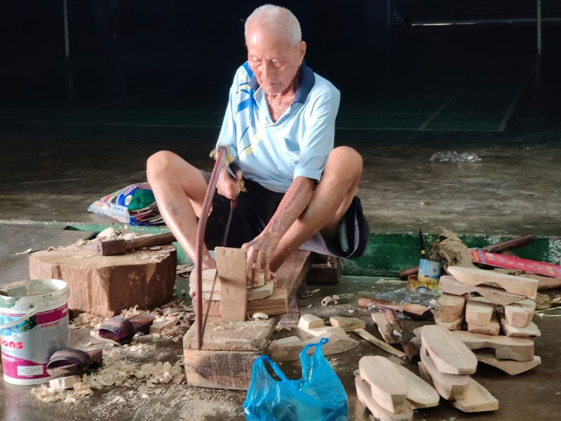 他讲解,制作一双木屐需经过多道工序。首先选用质地坚硬的木材,如甘榜常见的榴梿树木,锯切成适当尺寸后,在木板上勾勒出木屐轮廓,并进行初步切割定形。