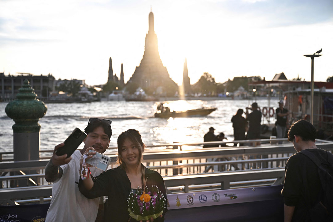 民众和游客5日聚集在曼谷郑王庙的池塘边放水灯。