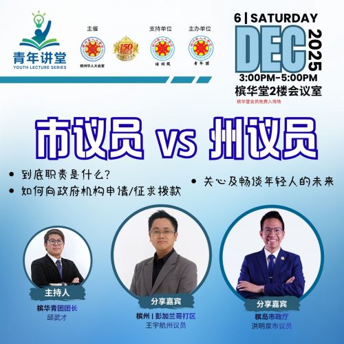本场讲座以“市议员 vs 州议员”为主题,特邀槟岛市议员洪明泉与槟州彭加兰哥打区州议员王宇航担任主讲嘉宾,他们将以实务经验分享地方与州层面的议政日常与挑战,旨在让青年深入了解地方政府与州层级议员在公共治理中的角色、职责及实际影响力。现场由槟华堂青年团团长邱武才主持,确保讨论深入且具启发性。
