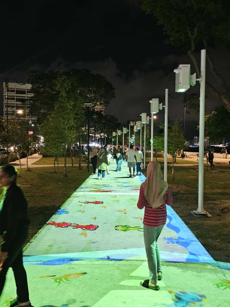 根据记者观测,“灯光秀步道”的投影画面主题多样,有中国风格、大马本地风格、宇宙及动画等,满足民众的视觉享受,驻足良久观赏与互动。
