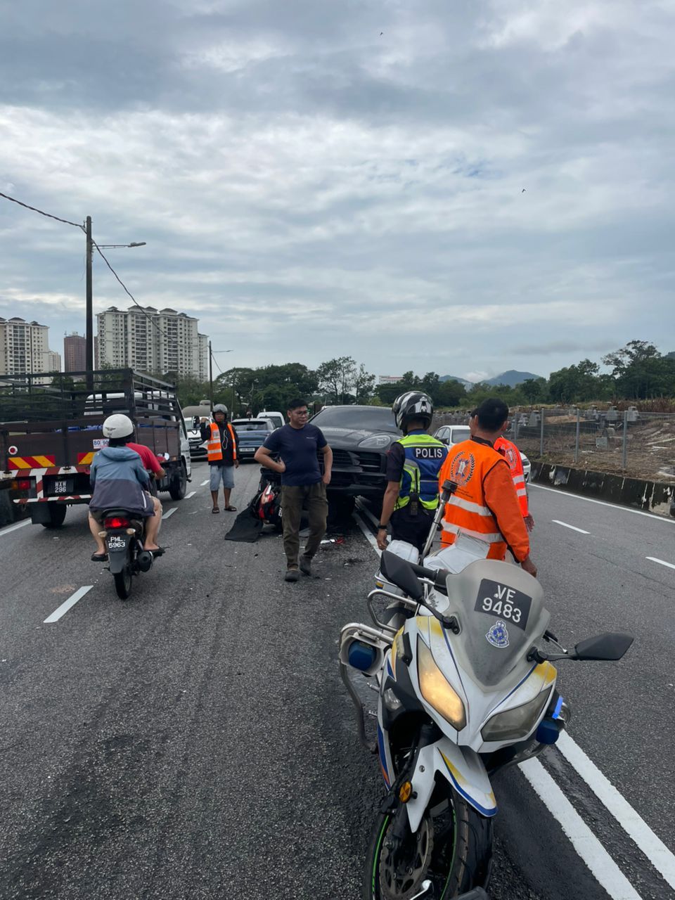 他说,事发时,一辆从白云山方向往峇都蛮方向行驶的丰田轿车突遭一辆从反方向驶来的保时捷休旅车闯入其车道,随后猛烈碰撞丰田轿车及另外两辆摩托车。
