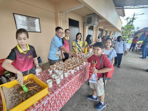 蔡天喜(左2起)、章勇杰、江凤莲及家协成员一起为华益小学学生分派食物,欢庆儿童节,共享欢乐时光。
