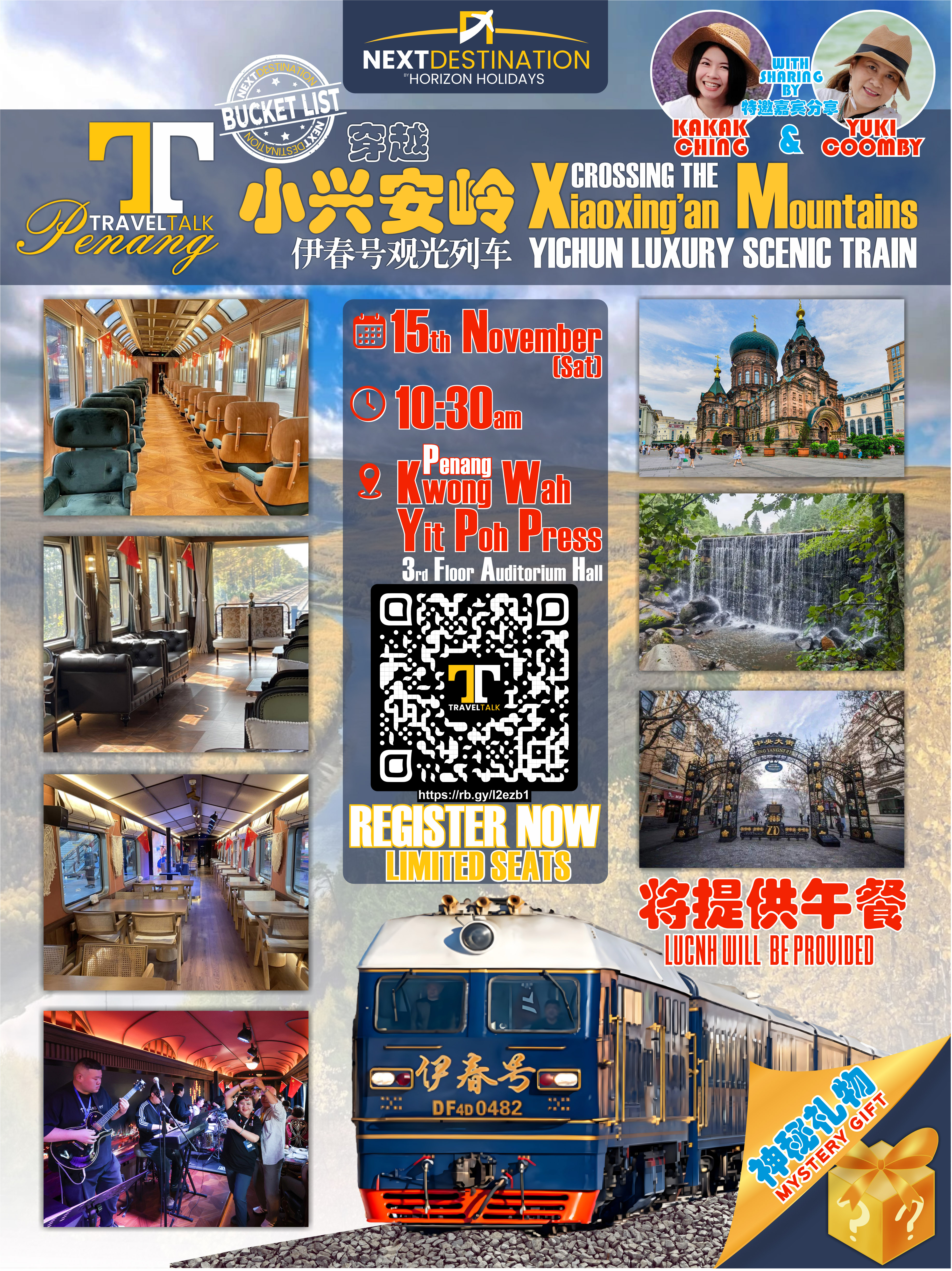 由海连天假期(Next Destination by Horizon Holidays)主办的“穿越小兴安岭–伊春号观光列车“旅游分享会,将带您展开一场视觉与心灵的旅程,一同感受中国北方壮丽的森林与河川风光,体验亚洲顶级的奢华列车——伊春号观光列车。