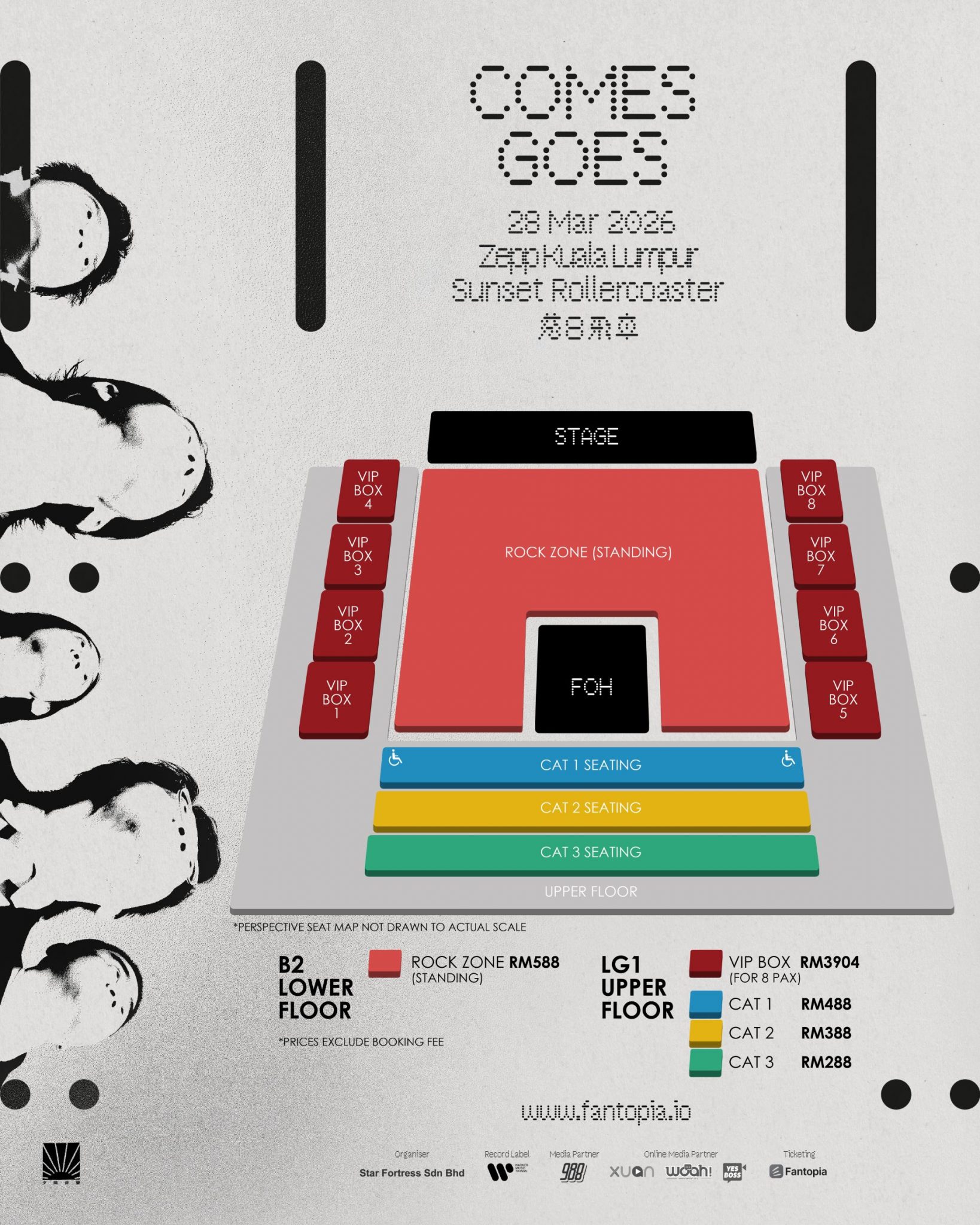 来自台湾以浪漫与复古氛围着称的独立乐团落日飞车(Sunset Rollercoaster),正式宣布将于2026年3月28日(星期六),晚上8点在Zepp Kuala Lumpur举办《Q COMES Q GOES》巡回演唱会,为马来西亚歌迷带来一场梦幻又温柔的音乐盛宴。