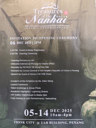马来西亚首场融合历史、文化、文物再生、创意与当代艺术的国际跨界艺术展——《南海之宝Treasures of the Nanhai》,订于12月5日至14日在槟城Think City @ UAB大厦举行。