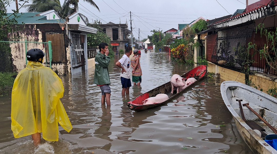在卡坦端内斯省潘丹市,居民用木船疏散猪只。