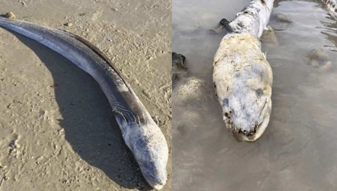 德莱妮表示,当时她远远看见一团黑影躺在沙滩上,走近一看竟是一条长长的鱼类,头部巨大、身体灰蓝色,外形相当奇特,“我从没看过这样的东西,看起来就像一条巨大的鳗鱼,实在太震撼了”。她事后将照片上传社交平台,引发民众热议,纷纷猜测这条“怪鱼”究竟是何方神圣。