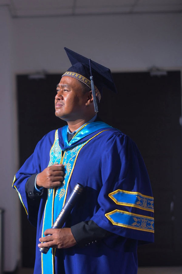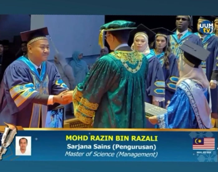 根据北方大学于周一(10日)在脸书发帖指出,这名35岁的毕业生莫哈末拉津拉扎里(Mohd Razin bin Razali),获得管理科学硕士学位,在北方大学毕业典礼中,从吉打王储东姑沙拉夫丁峇力沙手中接过毕业证书。