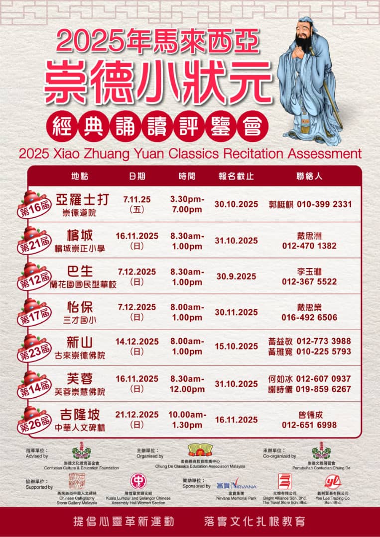 为鼓励儿童从小亲近经典、启迪智慧,《第26届吉隆坡小状元经典诵读评鉴会》将于12月21日(星期日)上午10时至下午1时30分,在士毛月中华人文碑林隆重举行。活动开放予全国各源流小学生及学前儿童报名参加,亦欢迎友族及残障人士参与。报名截止日期为11月16日,主单位呼吁有兴趣参与的家长们尽早为孩子报名,一同加入这场融合文化与教育意义的盛会。
