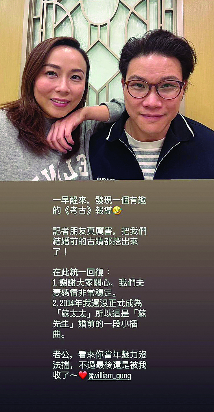 苏太太冯翠珊(Anita)在社群限时动态po出与丈夫合照,幽默表示报道其实翻出了婚前往事,“记者朋友真厉害,把我们结婚前的古迹都挖出来了!”她也统一说明夫妻感情稳定,并指出事件发生于2014年,当时她尚未成为“苏太太”,所以所谓密会只是苏永康婚前的小插曲。
