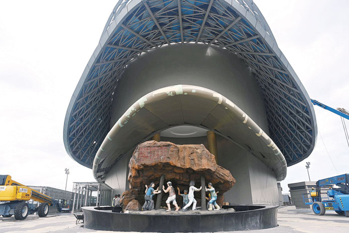 林祥雄教授介绍道,美术馆前设有一座长10米、宽6.5米的椭圆形喷水池。池中矗立一块倾斜巨石,由七人共同支撑。