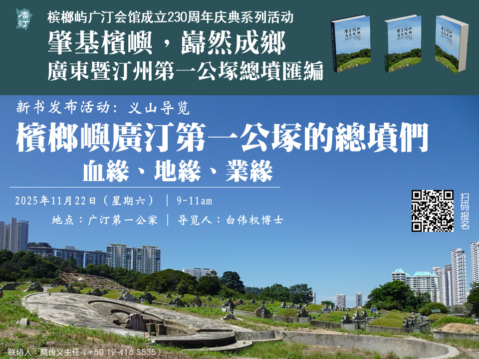 本次活动特别规划实地导览,引领参与者走进历史现场,感受先民胼手胝足的拓荒精神;下午的新书发布会将聚焦于总坟的系统性调查成果。《总坟汇编》共分“血缘”“地缘”“业缘”三册, 图文并茂收录了 117 座总坟的历史资料,系统呈现槟榔屿广汀第一公冢作为全马规模最大、墓葬最密集、历史最悠久的总坟群的重要价值。