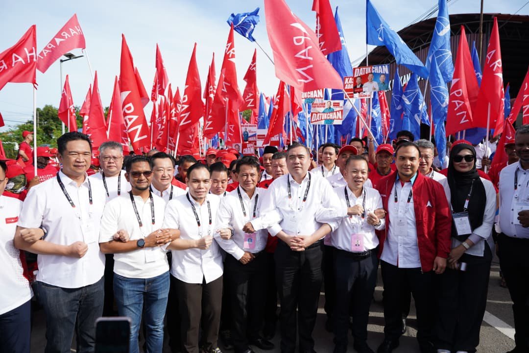 希盟支持者也纷纷穿著红色T恤,并挥舞希盟标志的旗帜,和候选人一同步行至提名中心,为候选人加油打气,现场气氛热烈。