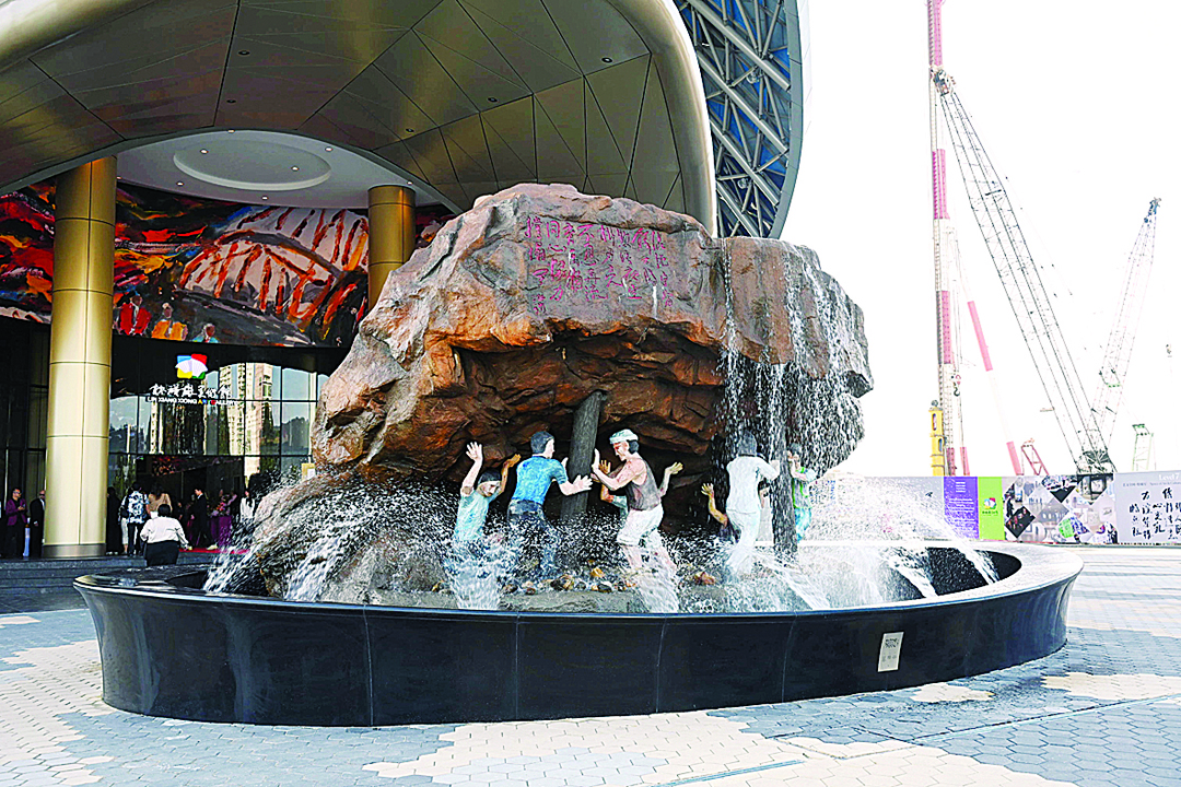 “东方推行的‘文明对话’才是全球80亿人口实现和能共处,和谐共存的推动力与凝固剂,更需同舟共济,相互依据与支撑,而这内涵意义便是化为美术馆前庭喷水池的石头下7位不同阶级与种族最像寓意,即同心协力撑塌天!”