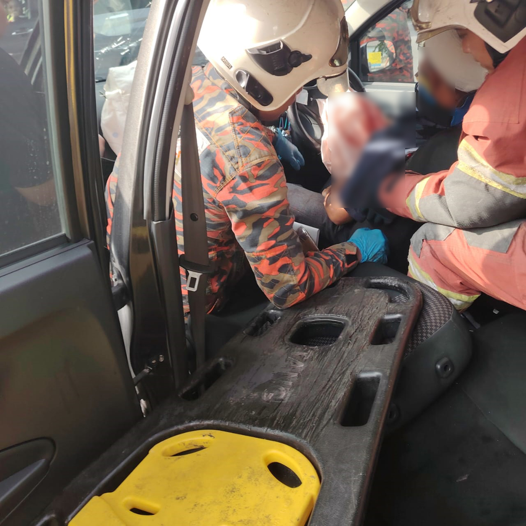 他表示,其中受困在一辆第二国产Axia轿车的61岁巫裔男子受困驾驶座和重伤,消拯员合力将伤者移出车外,复移交医务人员。