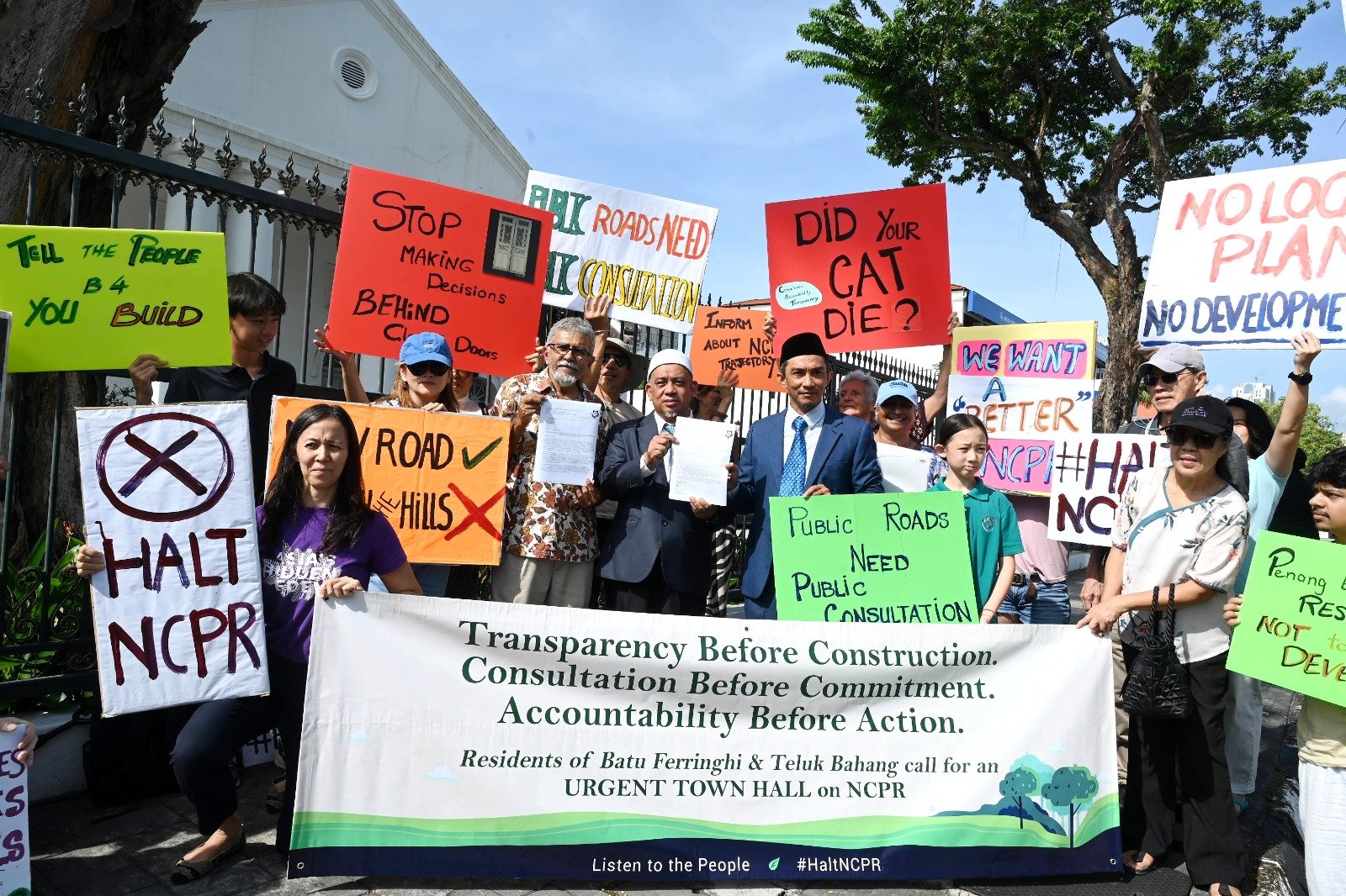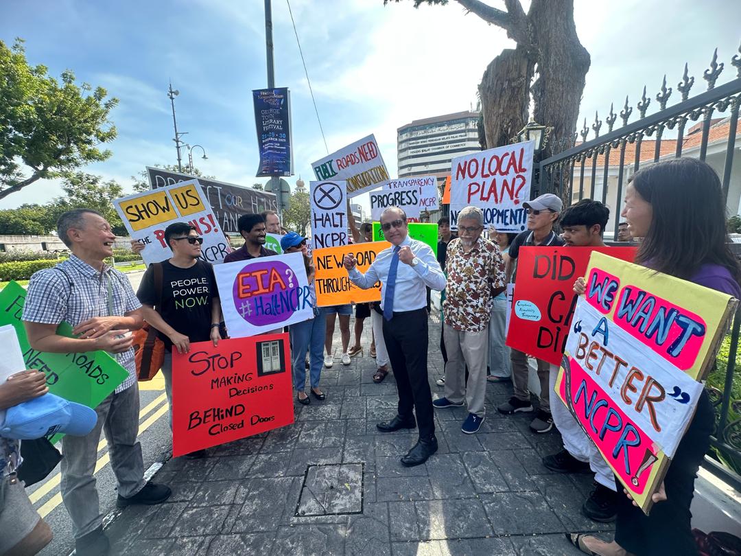 约20名来自丹绒武雅、峇都丁宜及直落巴巷的居民在槟州议会外高举大字报,同时提呈备忘录予槟州首长曹观友,促请州政府在兴建北岸高速大道(NCPR)前,与当地居民展开对话会,确保有关工程的规划过程问责透明。