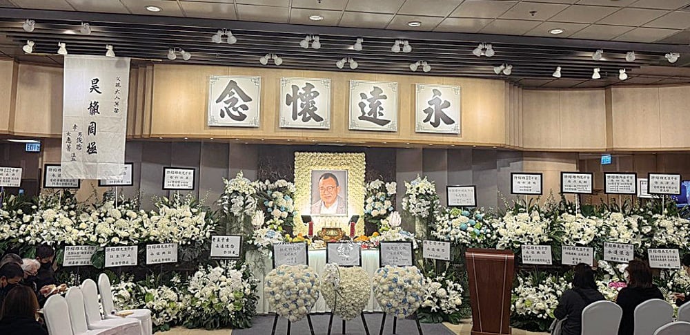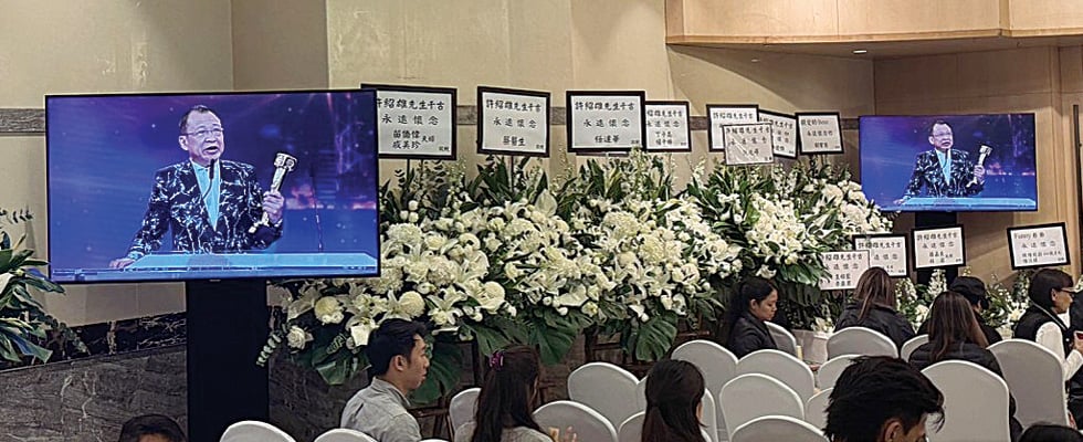 而灵堂的布置十分庄严,以5层玫瑰花包围遗照,旁边用上白、蓝色花做装饰,横匾写上“永远怀念”。灵前摆放3个花篮,中间为许绍雄太太“凤子”龙嬿而,花篮上“爱夫绍雄永记恩情”下款为“爱妻”。而女儿许惠菁与老公元晏的花篮,写上“亲爱的父亲永怀亲恩”,许绍雄的继子就以一家三口致意。