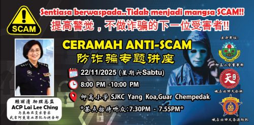 全国警察商业罪案调查局策略规划组主任赖丽清助理总监将在今年12月荣休前,返回家乡峨占必叻为乡亲主讲“提防诈骗,永不成为诈骗罪的受害者”专题讲座。