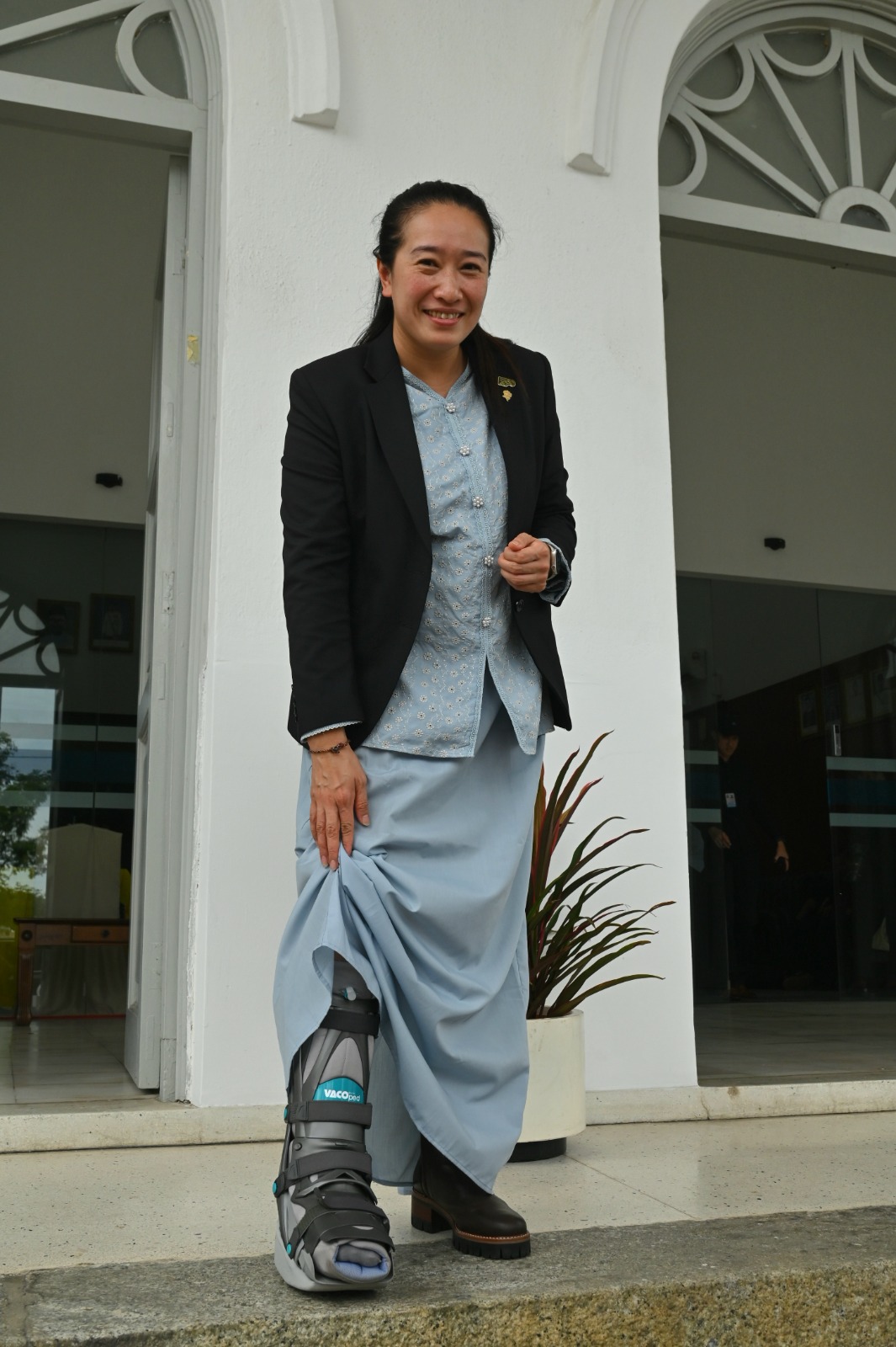由于跟腱撕裂,双溪浮油区州议员彭心慈必须穿上真空助行靴(Vacoped)才能行走!