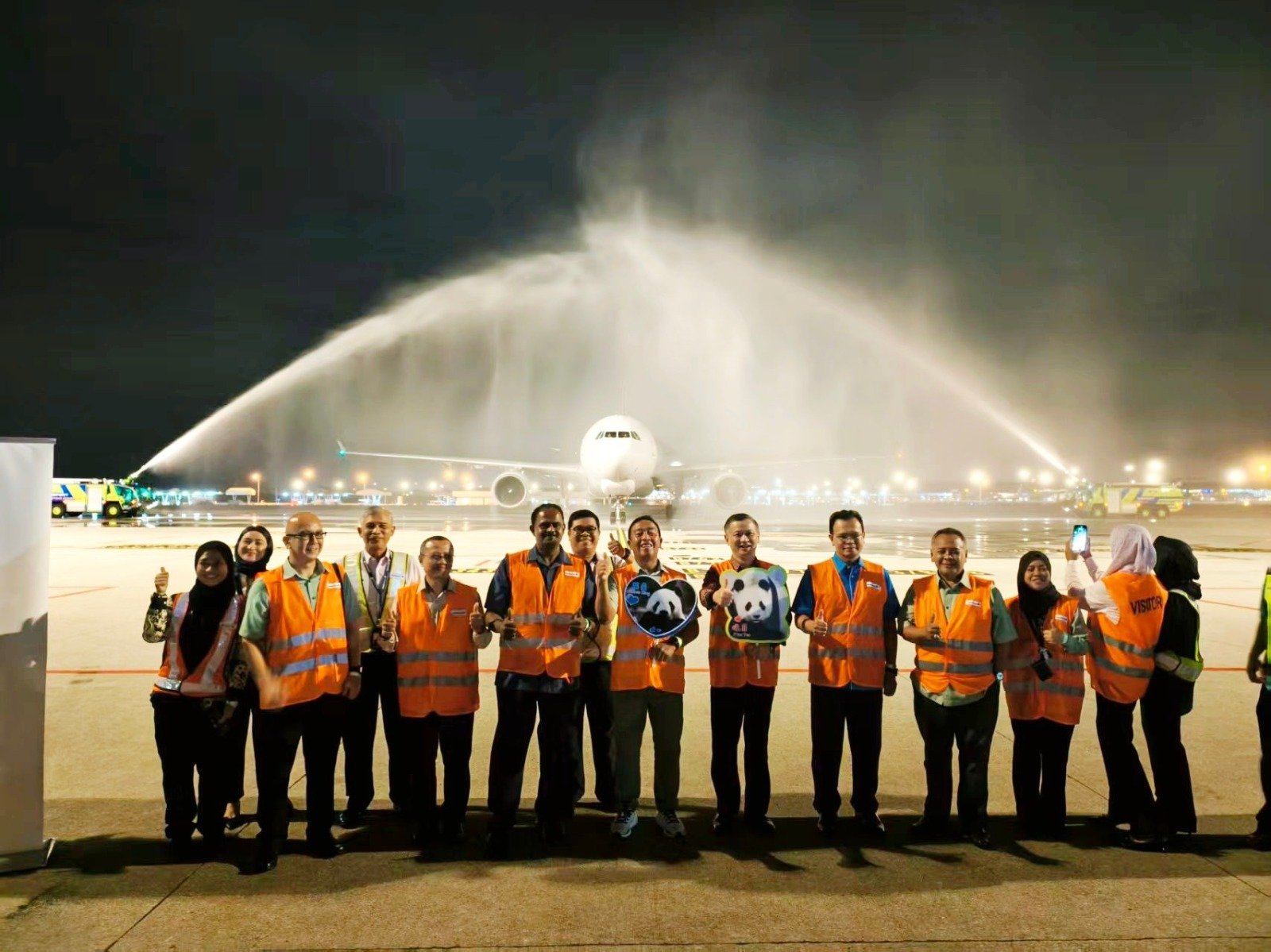 中国驻马来西亚大使馆郑学方公使、马来西亚天然资源与环境永续部生物多样性与森林管理司司长希瓦库马尔、马来西亚半岛野生动物保护及国家公园局局长卡迪尔、马外交部东亚司司长安努亚等到机场欢迎这对友好使者抵马,现场以“水门礼”隆重迎接“辰星”“晓月”的到来。