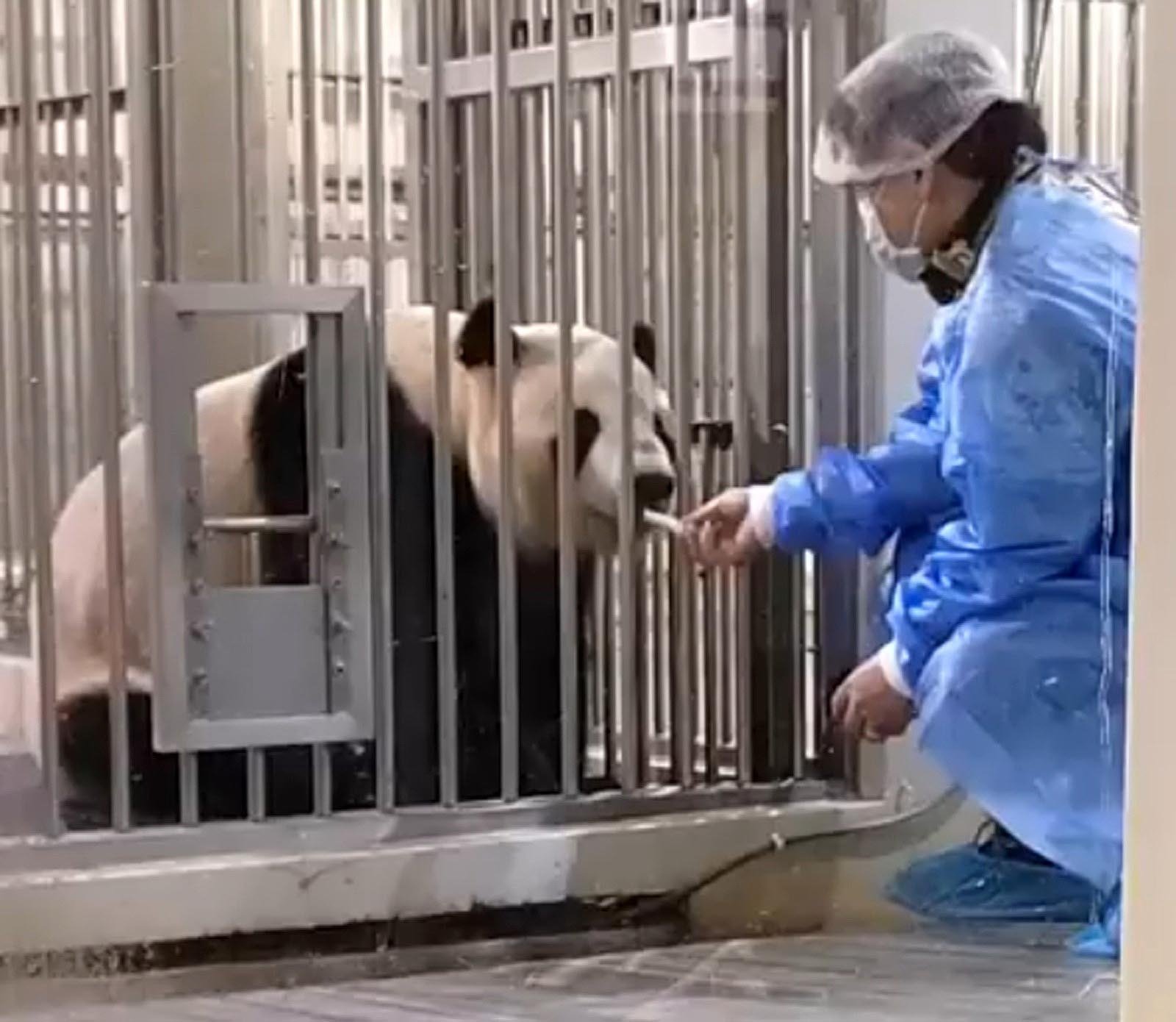 大熊猫抵达国家动物园的隔离检疫区,饲养团队在检查大熊猫的情况。