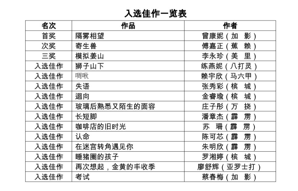 本届散文奖征文比赛参赛作品数量虽然比过去数届少,但年轻的一辈占了相当比例,这是一个令人欣喜的好现象。由此可见,我国喜爱写作的文友后继有人,可喜可贺。