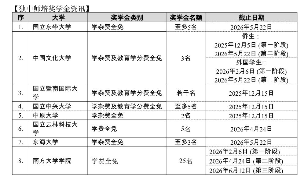 2./中国文化大学/学杂费及教育学分费全免/3名/侨生:2025年12月5日 (第一阶段),2026年5月22日 (第二阶段);外国学生:2026年2月6日 (第一阶段),2026年5月22日 (第二阶段)
