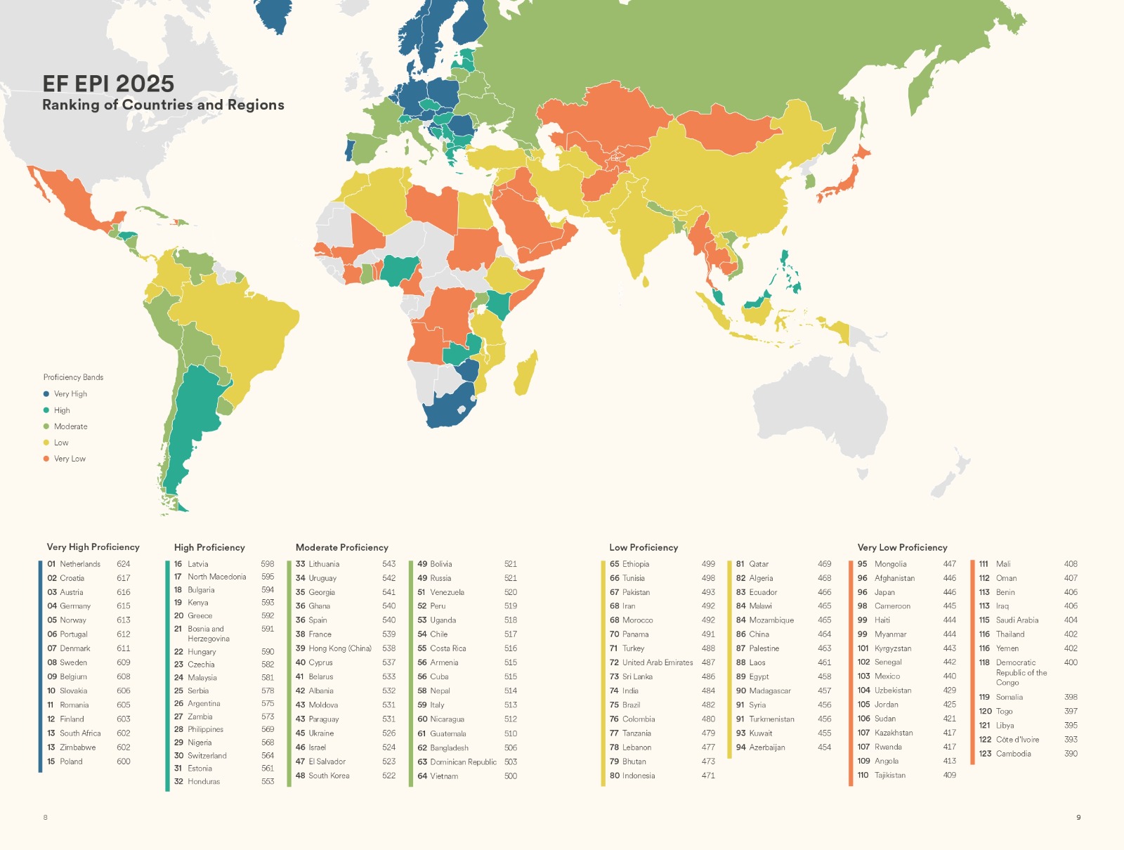 值得注意的是,新加坡在2025年的排行榜中被重新归类为“英语母语国家”,因此不再列入本年度排名。此前,新加坡在2024年排名全球第三,并稳居亚洲第一。