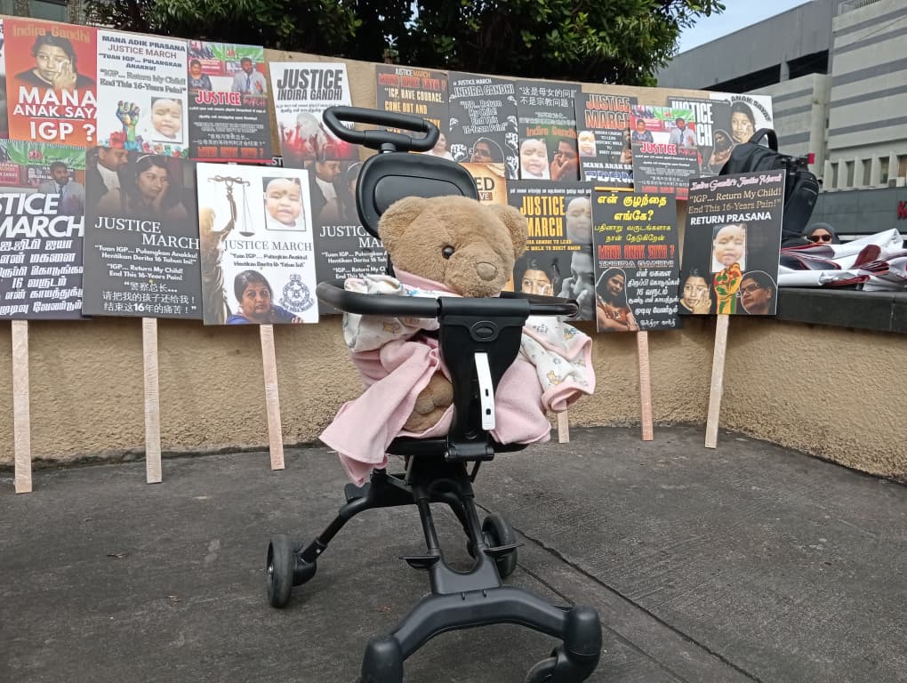 为“印裔子女改教案”事主发起的正义之行游行于上午11时15分开始,事主英迪拉把玩偶泰迪熊放在婴儿车后,率领支持者开始步行。