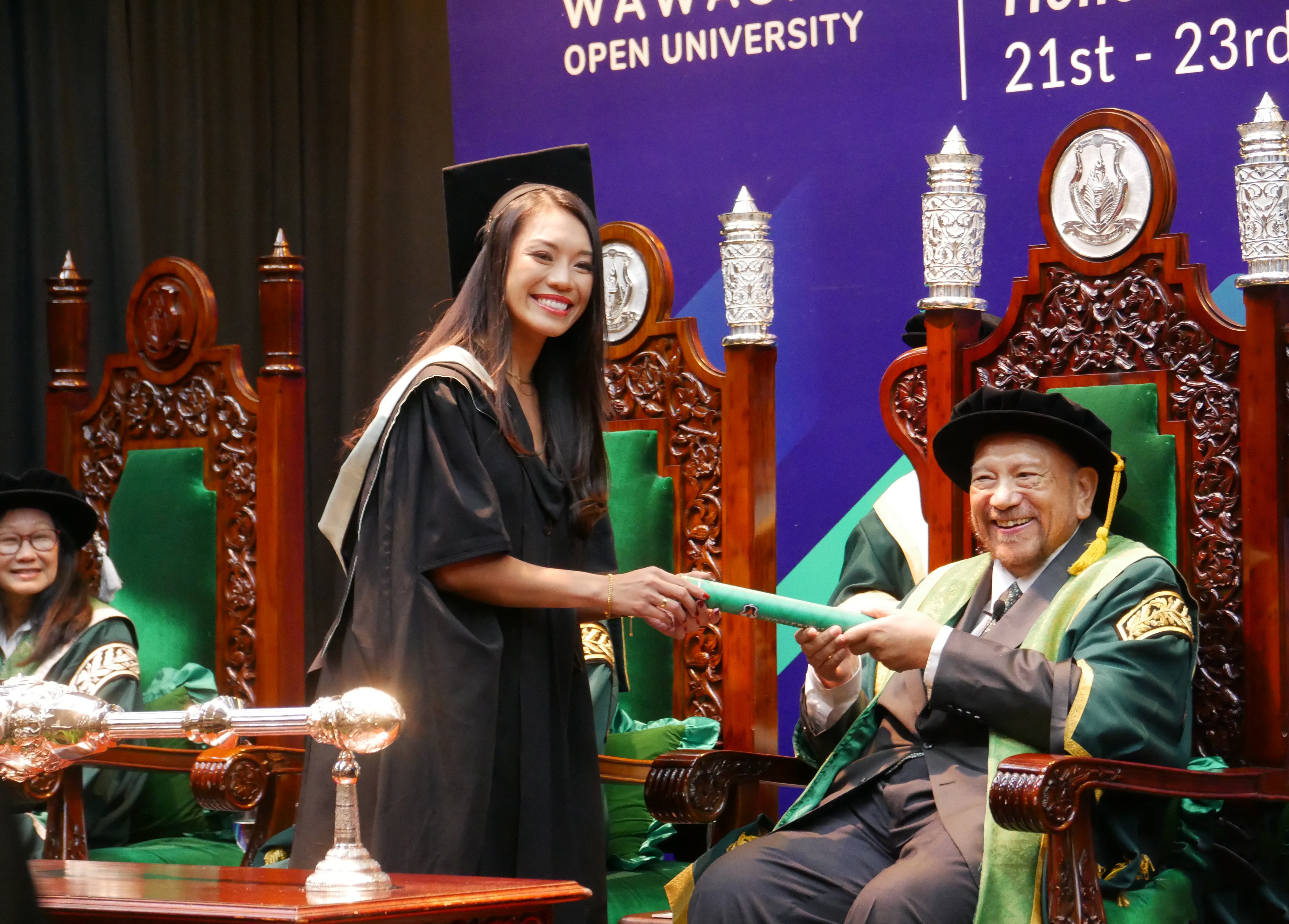 典礼上,该大学对多名学业表现优异的毕业生予以表彰。28岁的槟城家庭教育工作者Krystian Avik Lee,荣获“已故敦林苍佑医生纪念金奖”,并以研究生代表身份毕业于心理学文学硕士;37岁的吉隆坡房地产顾问黄浩恒,荣获“校长金奖”,并作为本科生代表毕业于金融商学士(荣誉);来自槟城、28岁的杨晨仕,获得“已故敦林敬益医生纪念金奖”,毕业于心理学文学士(荣誉)专业;32岁的物料管理专员陈天木,则获颁“LogM-WOU最佳学生奖”,毕业于物流与供应链管理商学士(荣誉)专业。