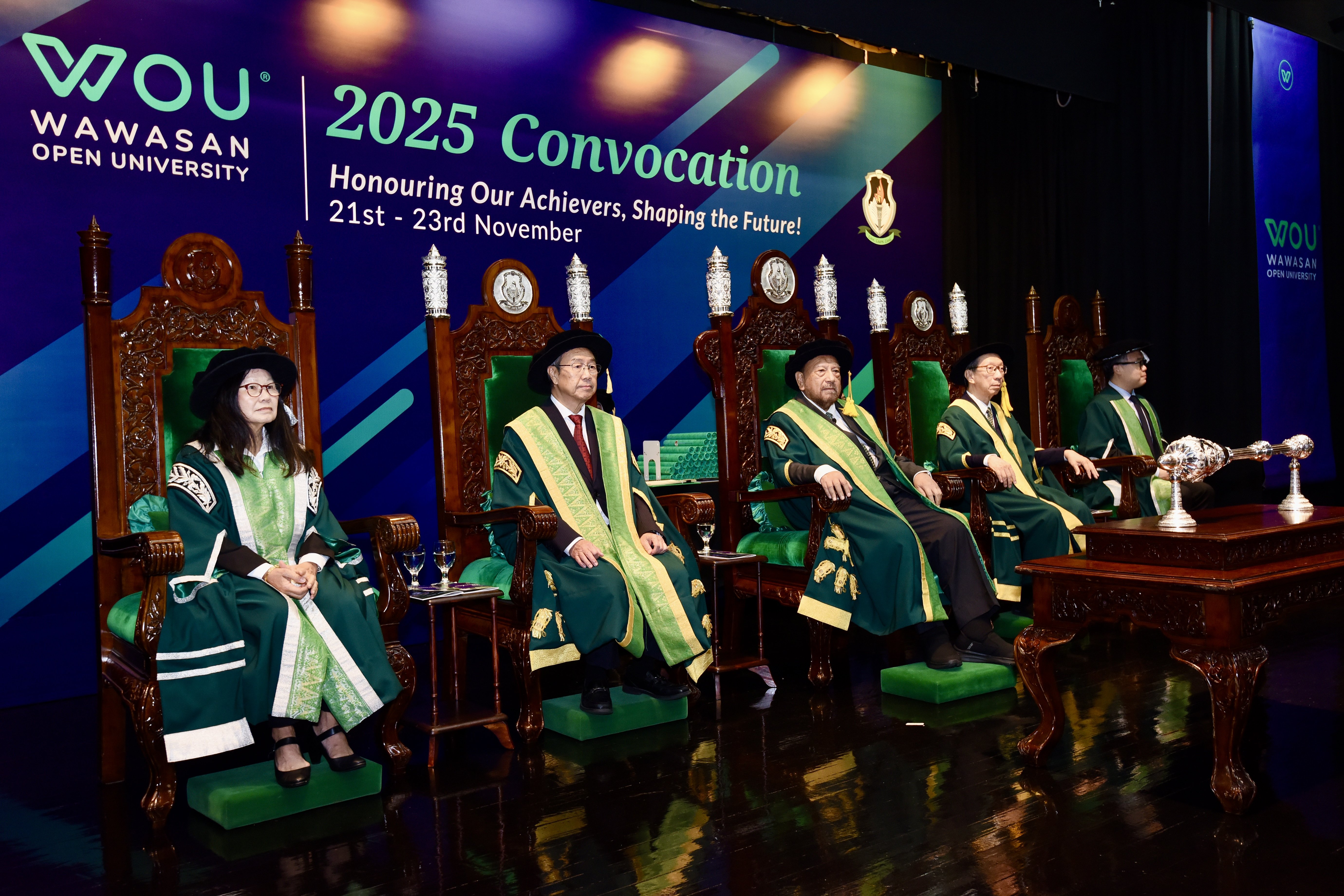 本次典礼同时也在宏愿开放大学名誉校长丹斯里东姑英南主持下,见证丹斯里郑可扬就任第三任名誉署理校长。主宾尚有理事会主席丹斯里许子根博士、学术事务副校长叶永华教授。