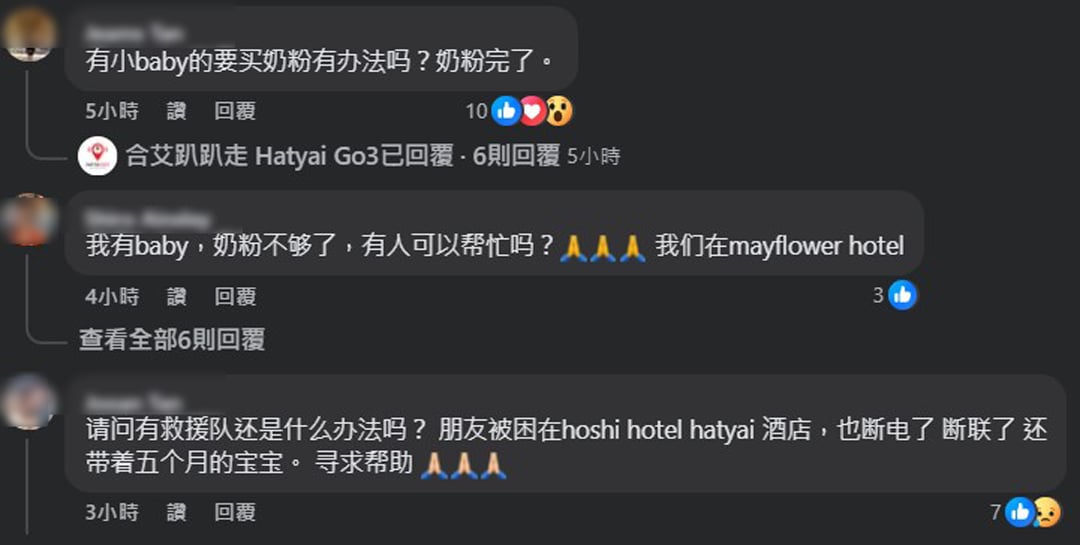 泰南合艾发生严重水灾,造成多个地区断电,约4000名大马游客受困在当地酒店,有者表示已断粮、与友人断联,有者则表示年幼孩子需要奶粉等,纷纷通过社交媒体发帖文及留言求助。