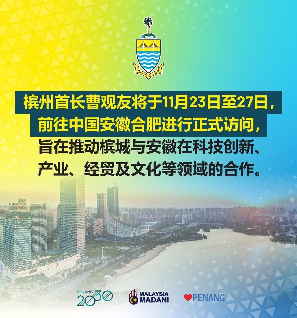 首长办公室周日(23日)发文告说,此行是应安徽省人民政府的邀请,前往安徽省会合肥进行考察交流,旨在推动槟城与安徽在科技创新、产业合作、经贸往来及文化交流等领域的深度对接。
