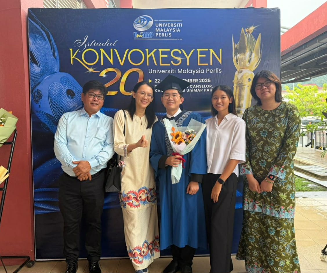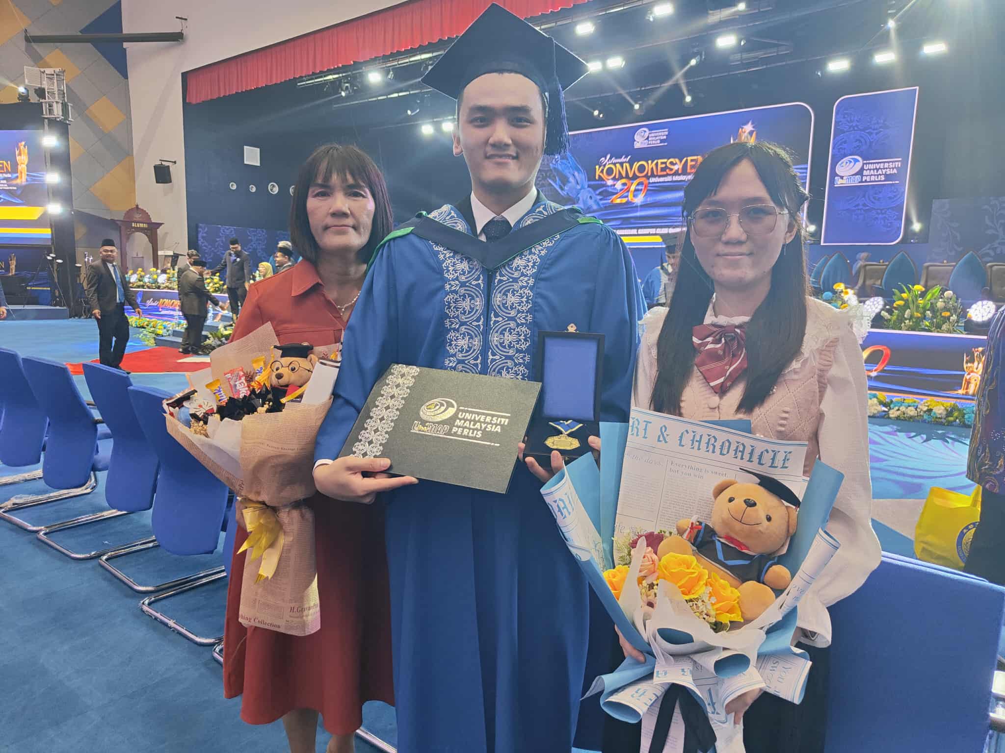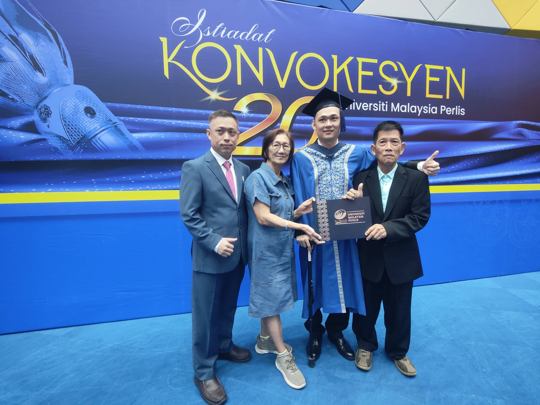 在UniMAP毕业典礼首场中,梁健益拄着拐杖与378名毕业生一同领取学位,他的父母梁源钊与罗玉珠,以及哥哥梁健玮也到场分享喜悦。