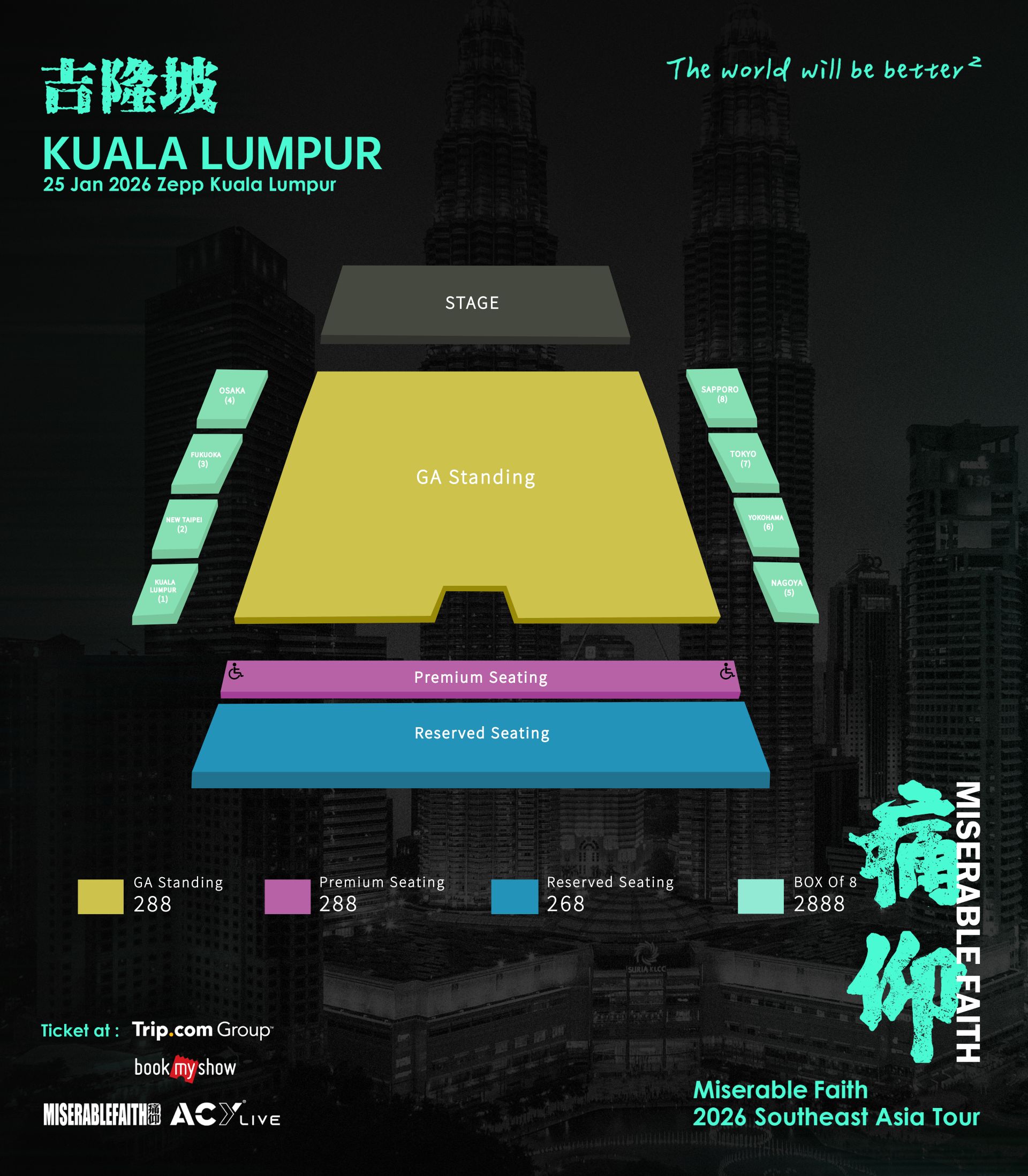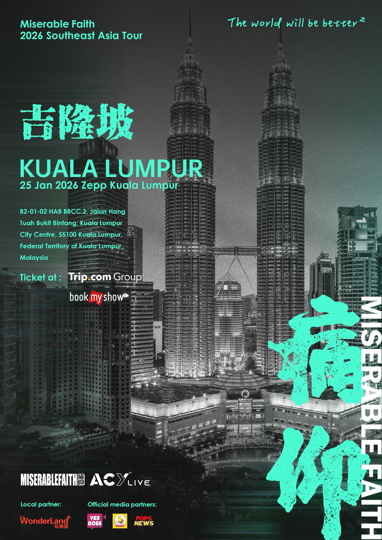 由痛仰乐队与ACYLIVE联办、The WonderLand Plus协办的《The World Will Be Better2》2026东南亚巡演-吉隆坡站,将于2026年1月25日(星期日),晚上7时于吉隆坡ZEPP举行。票价分为2888令吉(VIP厢,最多8人)、288令吉(优质座位区)、288令吉(站区)及268令吉(预留座位区),所有票价不含4令吉手续费,官网购票平台:my.bookmyshow.com 与Trip.com 。