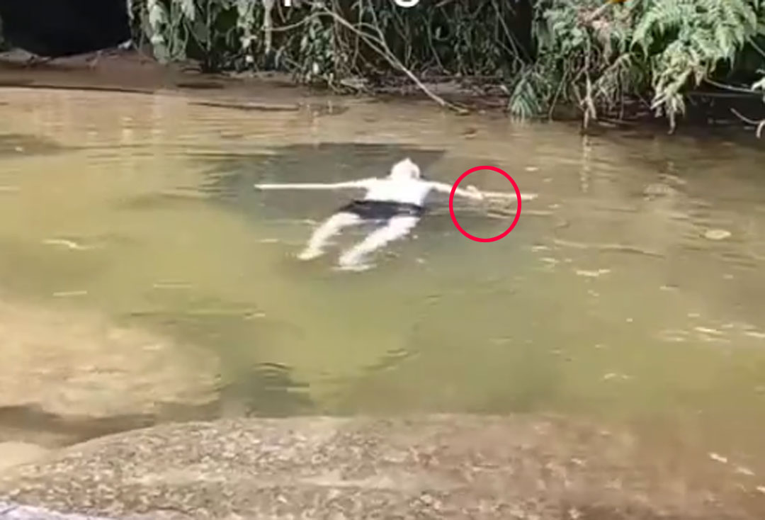 男子在享受溪水时,蛇突然造访。