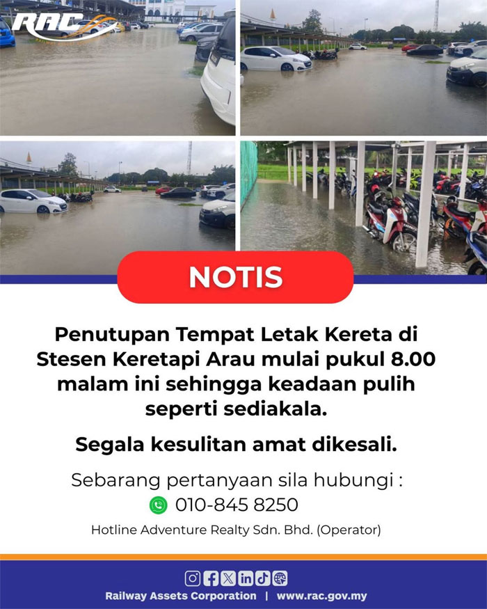 大马铁道资产机构(RAC)宣布,亚娄火车站的停车场将从周一晚上8时起暂时关闭。