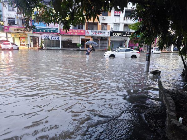 大山脚珍珠市(Taman Mutiara)在本月20日突发水灾,水位淹至车辆半粒轮胎。