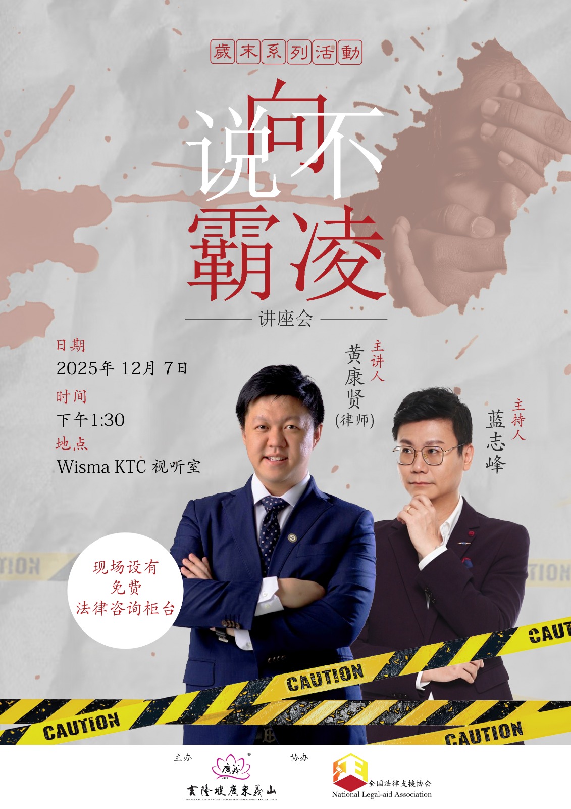 随着国内霸凌事件频频出现,公众对法律界定与求助管道的认知日益重要。为填补这一认知空白,有效应对霸凌问题,隆广义特此举办反霸凌讲座《向霸凌说“不”》。讲座会将在当天下午1时30分在广义大厦视听室举行,并特别邀请到全国法律支援协会全国总会长黄康贤律师担任主讲嘉宾,深度解析霸凌的法律界定、典型案例及应对策略。现场亦设免费法律咨询专区,届时将有执业律师团坐镇,为民众提供即时法律咨询、维护自身合法权益。