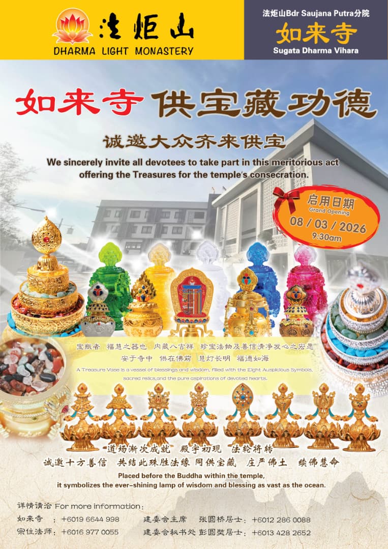 欲知宝藏宝瓶供养详情,可联络如来寺(019-6644 998)、宗住法师(016-977 0055)或圆奘(013-428 2652)。