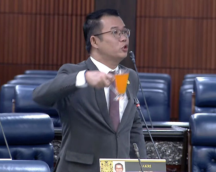 戴橙色领带的佐哈里(图)似乎认同陈泓宾的做法,但提醒称后者不要在议会内厅内饮用。