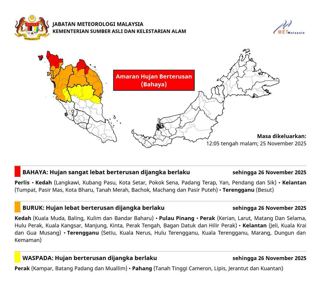 另一方面,大马气象局在周二凌晨12时05分在脸书发布了持续性降雨警报,涉及多个州属,并根据雨势分为红色、橙色及黄色警报,警报预计持续至本周三(26日)。