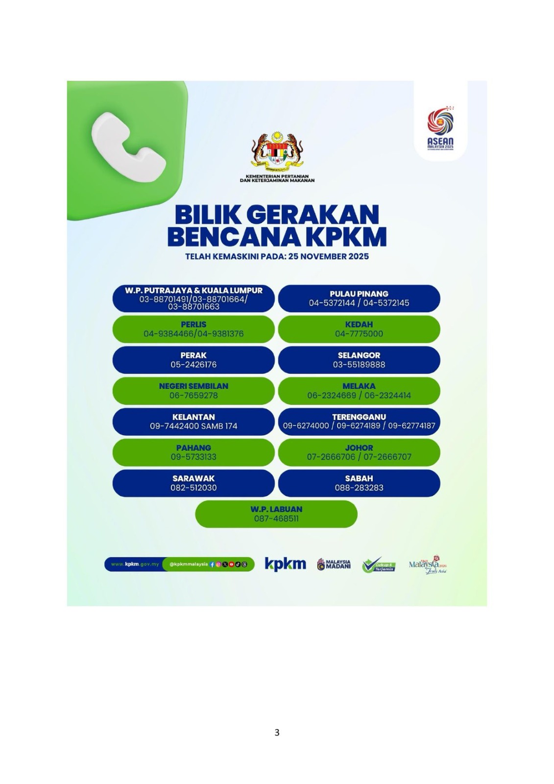 欲获详情,民众可联络农粮部灾难行动室,电话号码03-88701663/1664/1491,或州行动室以获取详情。