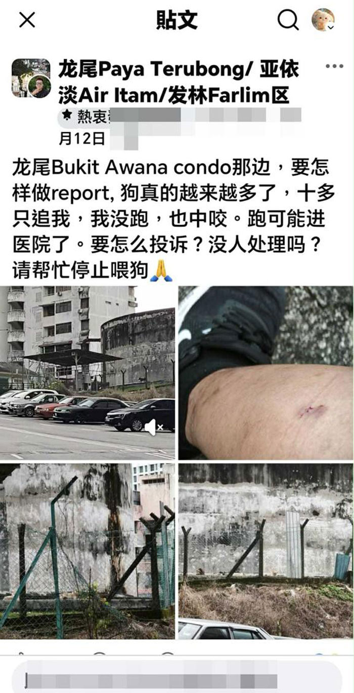另外,也有网民在垄尾群组留言的居民也写道,Bukit Awana 公寓附近的流浪狗“越来越多”,甚至有十多只同时冲向路人。