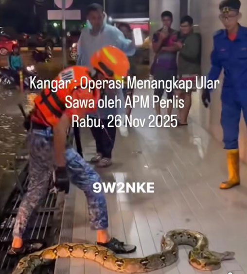玻璃市民防部队指出,投报事件大多集中在加央及亚娄的水灾地区,其中周四(27日)凌晨12时36分,加央Seruling路靠近马来亚银行(Maybank)与MR DIY商店附近,民众惊见巨蟒后,吓得连夜报案。